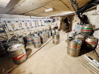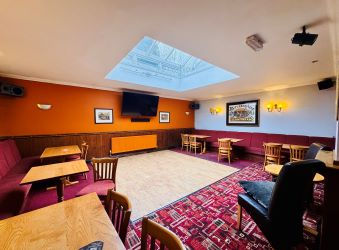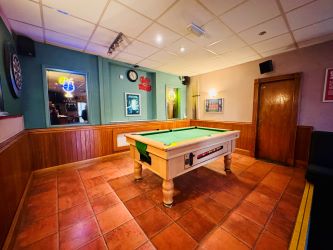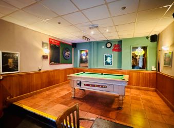 The ground floor provides a traditional pub layout in good condition throughout which includes a public bar, lounge/dining areas, a pool room with full-size pool table, darts area, and a servery/bar with associated trade fixtures and fittings. Additional features include a skylight in one seating area for natural light, multiple seating zones with wooden tables and chairs, dancefloor, a large TV for sports, and external beer garden/patio space to the front with picnic benches. There is also a kitchen with dumb waiter and supporting ancillary spaces.
